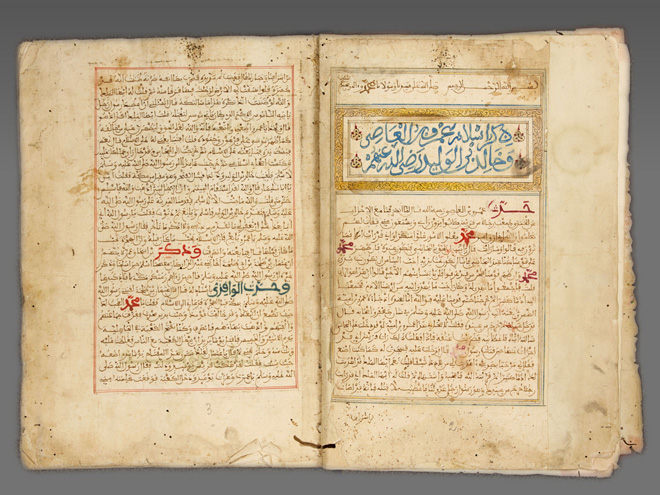 Rédigé à l’encre noir, rouge et vert. Frontispice de début enluminé avec le nom de l’auteur. Le manuscrit contient 180 feuillets de 25 lignes par page en « maghribi », avec reliure.