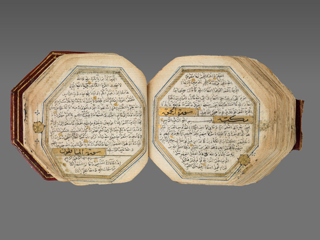 Manuscrit de 292 petits feuillets octogonaux de quatorze lignes par feuillet en minuscule calligraphié en écriture naskhî noir sur papier ivoire. Un double frontispice enluminé orne le début du Coran. Les titres sont en noir sur cartouches dorées. Des étoiles enluminées marginales signalent les « khamisates » (séparation de cinq versets). Les textes sont encadrés de filets bleus et dorés.