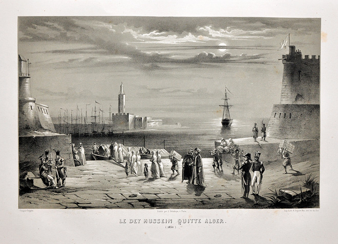 Lithographie : Le Dey Hussein quitte Alger (1830)